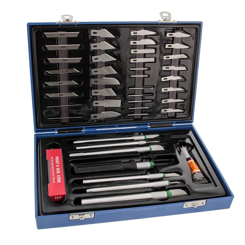 Within its sturdy plastic case are 7 knife handles: 1 — Mini Precision Handle for super delicate work 4 — Precision Handle for delicate work 1 — Medium Size for most types of work 1 — Heavy-Duty Handle for those large projects Set also includes: 40 — Precision Blades most of which are designed for different functions. 6 — Scribes 1 — Pocket and Desktop Sharpening Stone 1 — Super Type Glue for Plastics, Metal, Rubber, Leather, Glass and Ceramics 1 — Sturdy Plastic Case with Latches Keeps everything organized and the blades are all secured on a magnetic strip so you won’t loose another blade again.