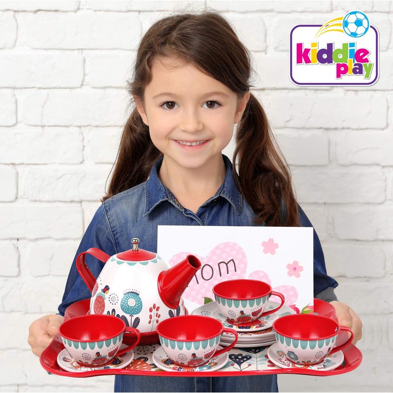 The Kiddie Play Tin Tea Set is a great gift to little girls and boys as an addition to their kitchen playset.