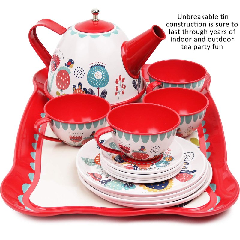 Tea Set for Little Girls, Pretend Play Tea Party Set, Floral Design Kids Tin Tea Set with Carrying Case (15 Pcs)