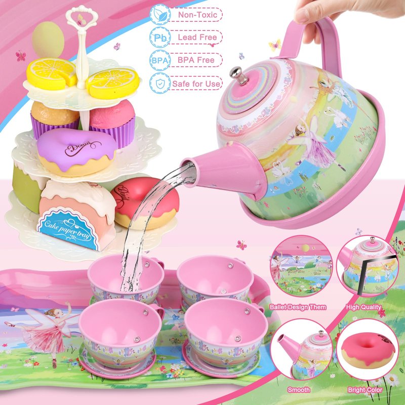- 【Premium Quality】This tea party set for little girls is made of non-toxic tin-coated iron material, good formability, corrosion resistance. The dessert accessories providing harmless plastic material, has long-lasting strength and use. Endless hours of tea time theme pretend role play for your kids.