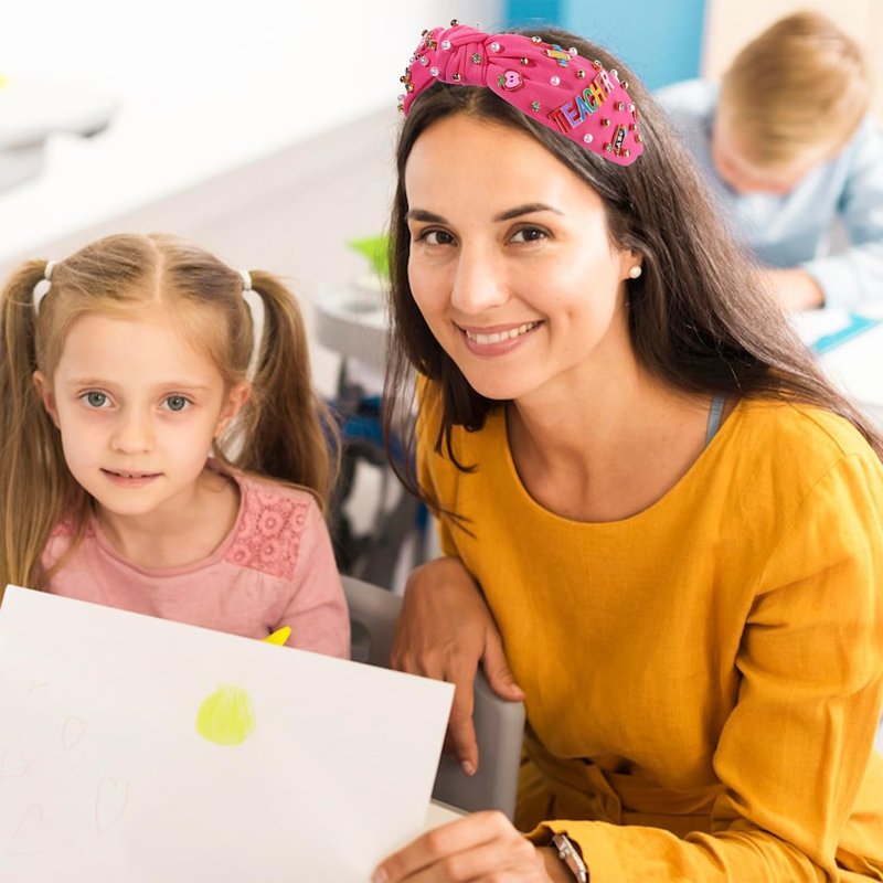 - ♥ Comfy Back To School Headband -- Start off your school day look with our pretty beaded headbands. These knotted headband for women made of premium quality soft fabric, accent with shiny crystals, pearls and alloy charms, which is stretchable, comfortable to wear, does not hurt the hair. Size: about 6.7x5.3inch. With our rhinestone teacher hairband, you can thank your favorite educators for changing your world. Perfect for teacher appreciation, end-of-year, back-to-school, or Christmas gift