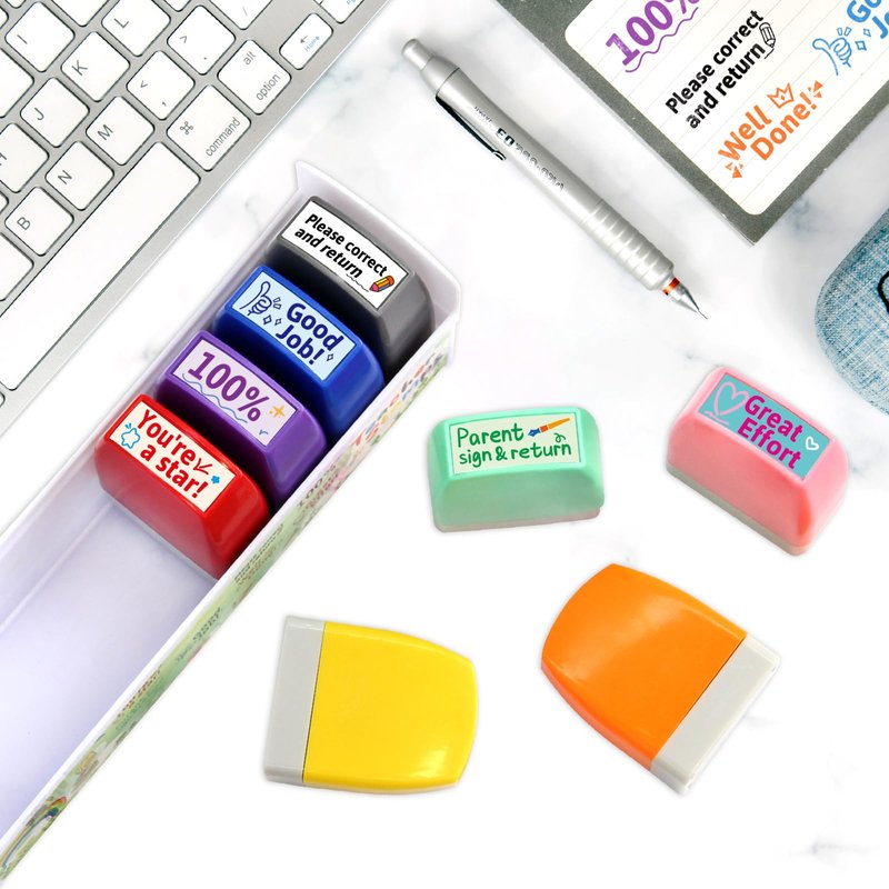 - Package Includes: 8 different teacher stamps with plastic storage tray.