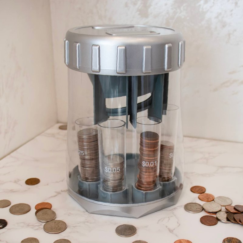 Gray Digital LCD Display automatically keeps track of savings; , Four tubes separate your quarters, nickels, dimes and pennies. Coins are inserted one at a time.