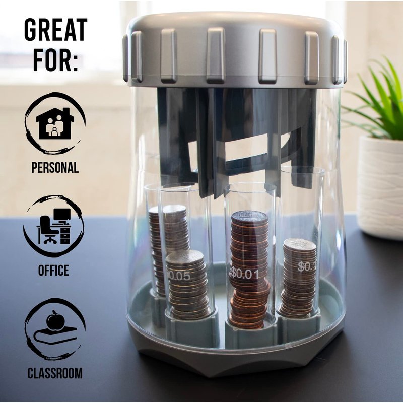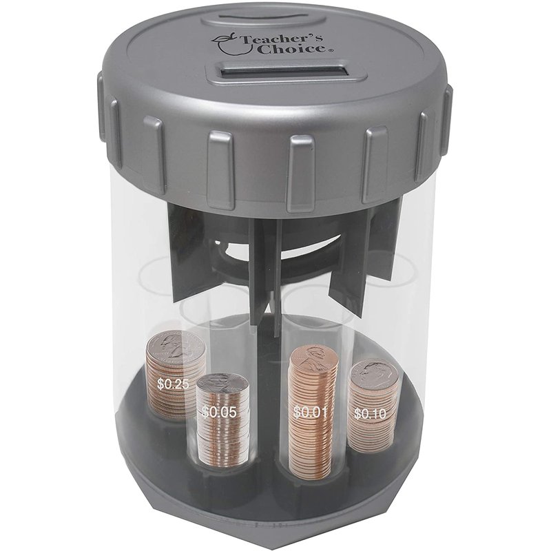 - 💰 The Teachers Choice Coin Counter and Sorter digitally counts and sorts pennies, nickels, dimes, quarters into 4 tubes which can be removed and used to fill the included coin wrappers. Size: 9.5 x 6.1 x 6 Inches. Accepts 2 AAA batteries.