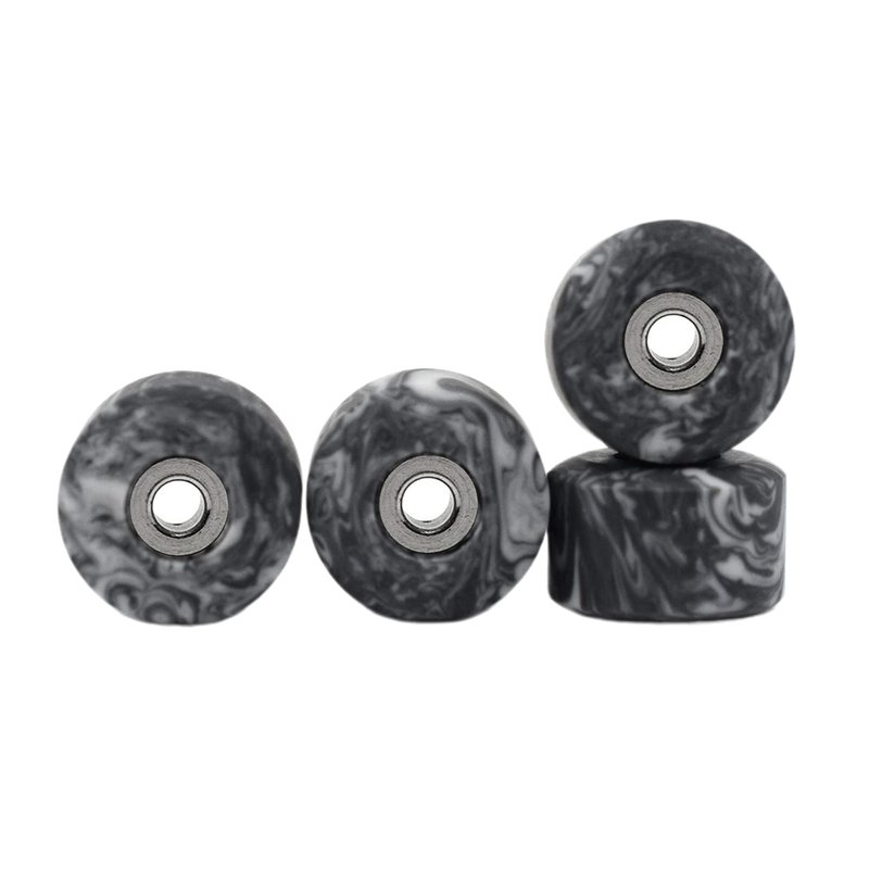 Set of four Apex Series, New Street Style Fingerboard Wheels in "Grey & White Swirl" Colorway. The New Street Style 61D wheels are our softest wheels yet, and are equivalent to 101A hardness. The feel of these wheels are very similar to real skateboard wheels. Measuring 7.7mm in diameter and 4.9mm wide, these wheels are great for easy riding and doing tricks on all kinds of surfaces. These wheels are designed and made in the USA using a premium quality, custom Teak blended urethane. Each wheel is casted and cut in New York. Colors are handmixed and may vary slightly between sets. Many fingerboarders love the squeak sound that urethane wheels make as you powerslide across a surface or do a sharp turn.