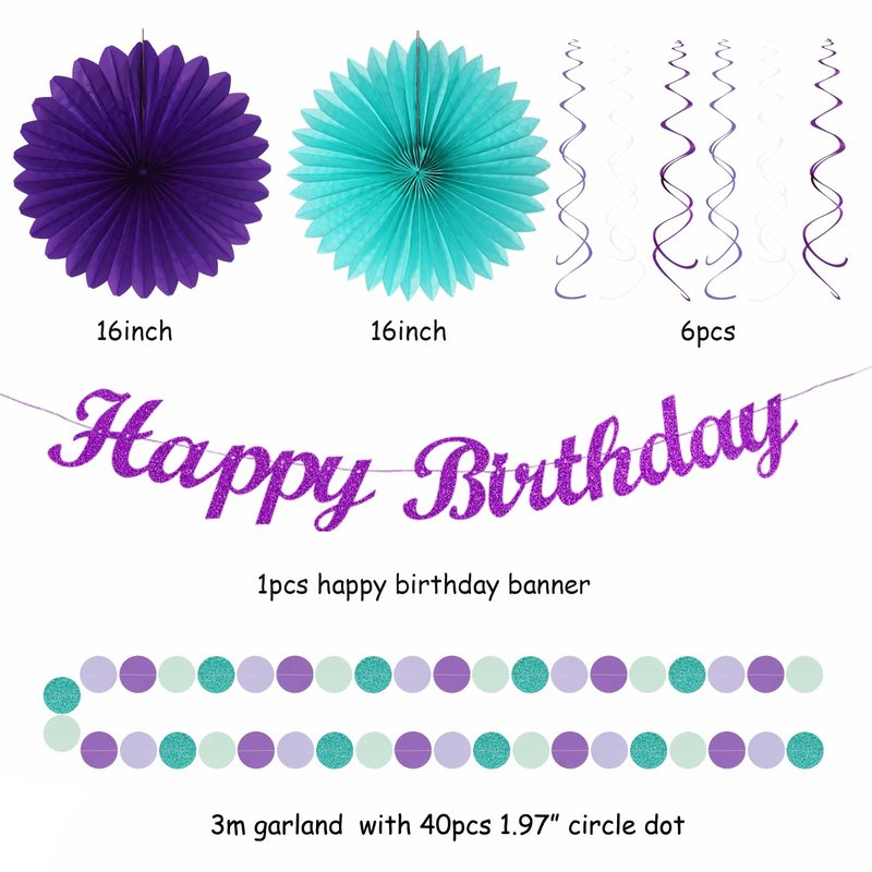 - 【Teal Purple Lavender Party Favors】This kits include 1pcs happy birthday banner, 1pcs circle dots paper banner, 4pcs tissue pom poms: 3pcs 10" and 1pcs 12" , 3pcs 8inch paper honeycom ball, 2pcs 8inch paper lantern, 4pcs 12inch paper flower fan, 6pcs Paper swirls hanging streamers.