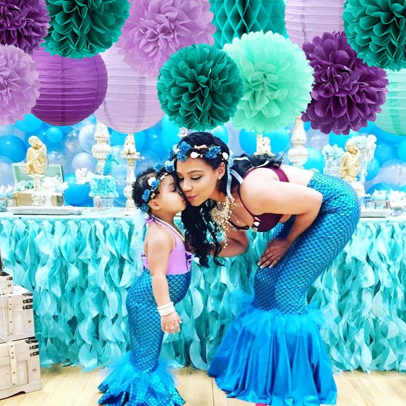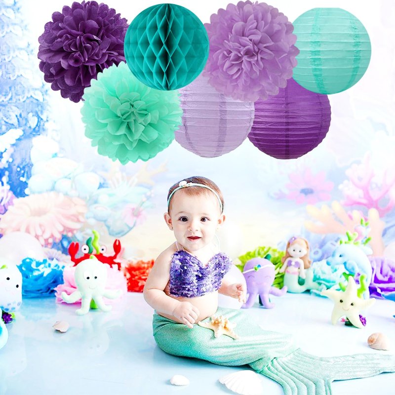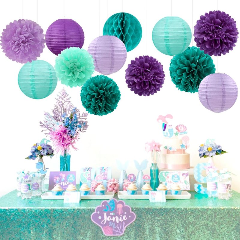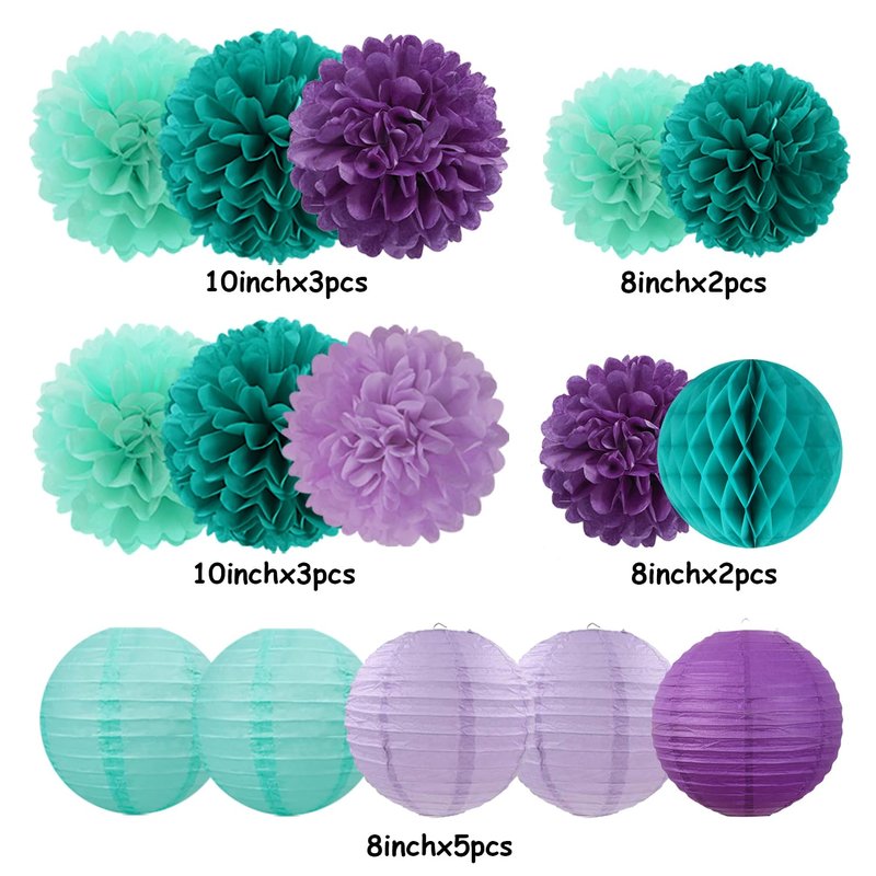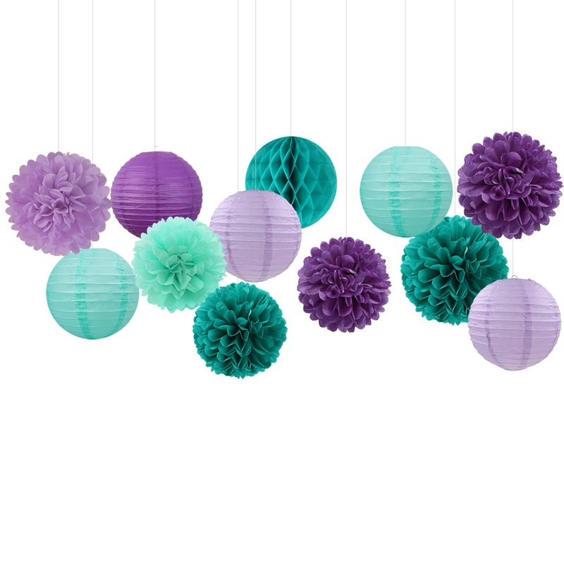 Teal-Purple Party-Decorations Paper Flowers Lanterns - 15PCS Lavender Girl Mermaid-Birthday Tissue Pom Poms Streamers,Baby Bridal Shower Wedding Classroom Hanging Supplies Decor Hugfond