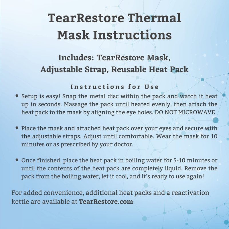 The TearRestore Warm Compress Eye Mask represents a revolution in the area of warm compresses, Dry Eye Treatment and Stye relief. Self-heating reusable heat packs deliver precise therapeutic heat directly to the oil glands within the eyelids. Each premium heat pack can be used up to 90 times, making this mask the perfect daily treatment for Dry Eyes. Developed with top eye care professionals, the TearRestore Thermal Mask naturally loosens styes and promotes the expression of the meibomian glands. Non-toxic ingredients and hygienic design assures this warm compress will be safe, convenient, and effective. TearRestore Thermal Eye Mask is the best heated eye mask.