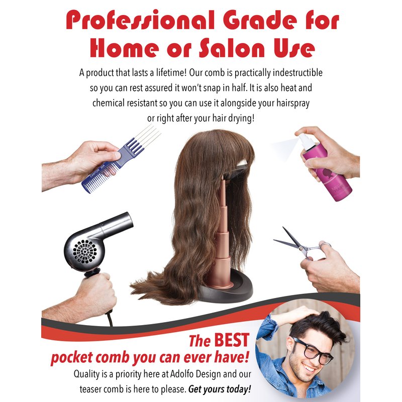 With Adolfo Design, you're getting a product that lasts a lifetime! Our comb is practically indestructible so you can rest assured it won't snap in half while styling even the toughest roots. It provides an effortless and painless straightening process that will keep you always using it on a daily basis. It is also heat and chemical resistant so you can use it alongside your hairspray or right after your hair drying and there will be no damage done to it! Quality is a priority here at Adolfo Design and our teaser comb is here to please. Get yours today!