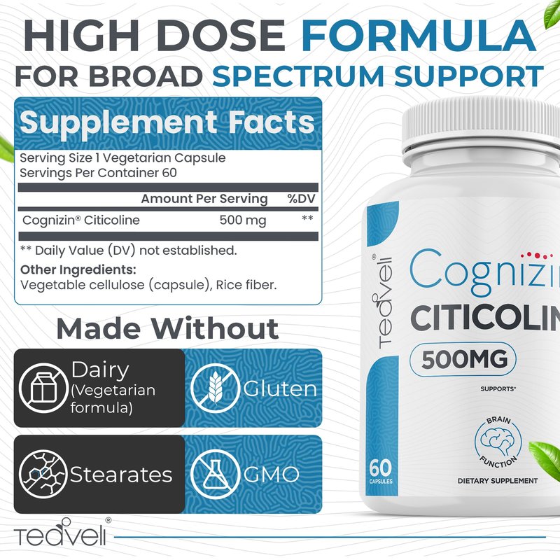 Teaveli Cognizin Citicoline- 500mg CDP Choline Capsules- Clinically Studied Brain Supplement to Support Clarity, Concentration and Memory – Most Bioavailable Form of Choline Supplements - 60 Servings
