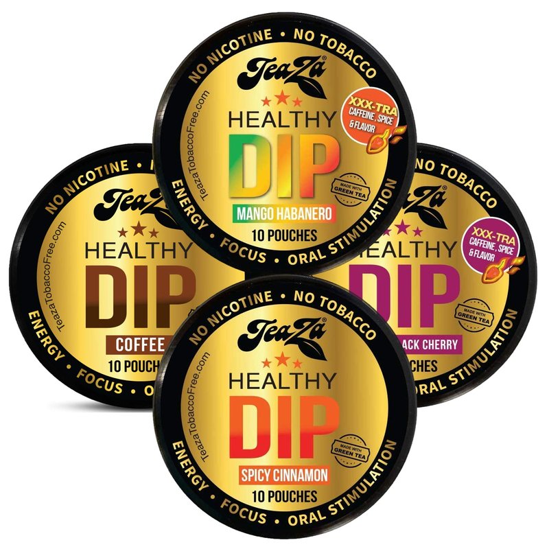 - 4 Cans of TeaZa Pouch Variety Pack and 1 DC Crafts Nation Skin Can Cover. Includes 1 of Each Flavor: Cinnamon, Mango Habanero, Coffee, and Bangin Black Cherry.