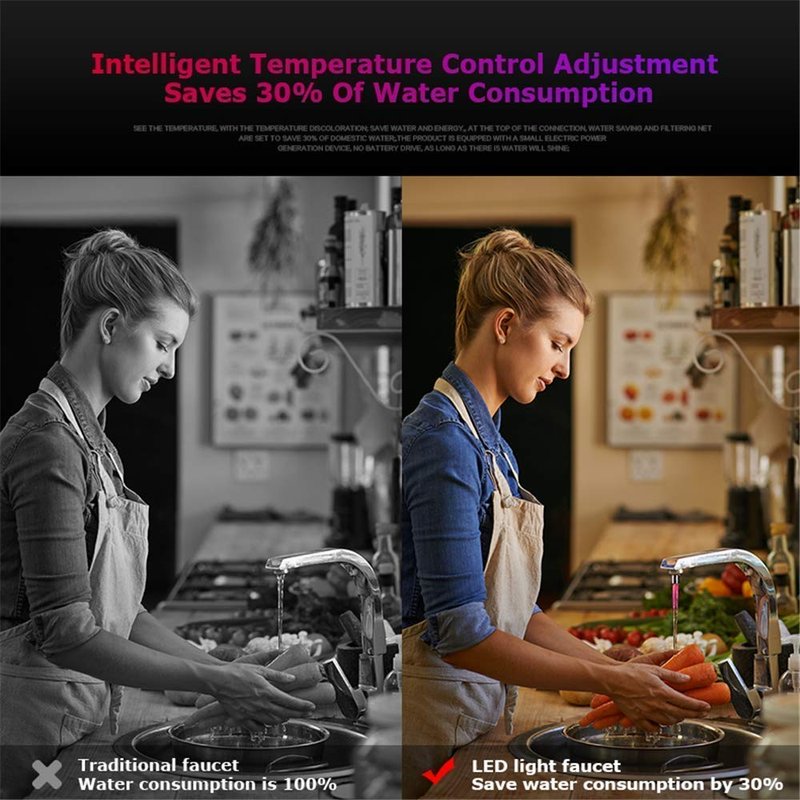 - ✔Rely on hydraulic drive generating their own power, No need for the power supply, safe and environmental.The sensitive faucet light will change colors according to the temperature of water.