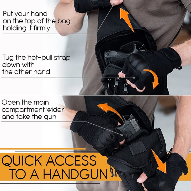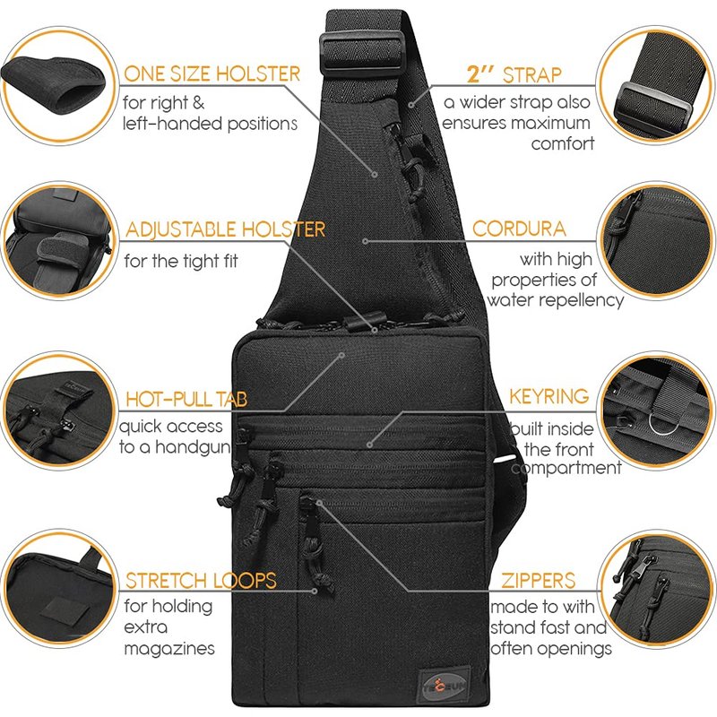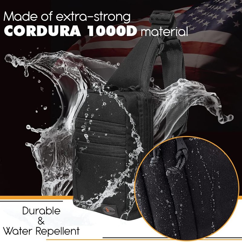 - PRACTICAL LAYOUT: The ccw bag includes 5 compartments for carrying and easy access to your pistol and other essentials like pocket knife, phone, keys, documents, etc. Wear on your chest, back or shoulder.