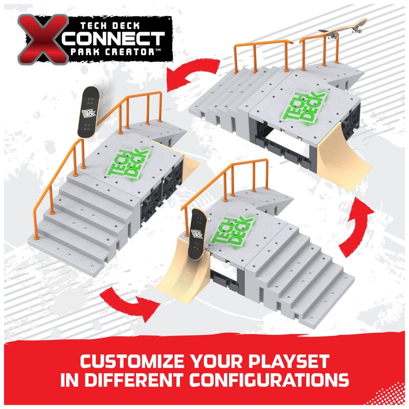 - CUSTOMIZABLE PARK: Design and build your custom mini skateboard park with the Tech Deck Flip N’ Grind X-Connect Park Creator skatepark ramp set. Set up different combinations with the staircase, ramps, and rails to learn and progress your tricks.