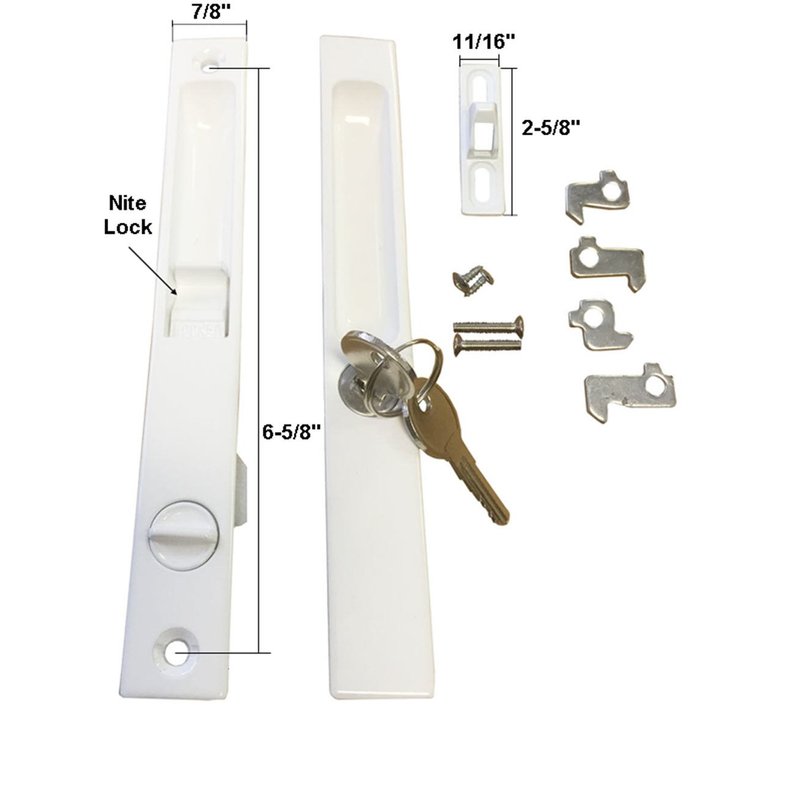 TechnologyLK Sliding Glass Door Handle Set, Keyed, Flush Mount, with Nite-Lock and Five Hook Assortment, White, 6-5/8" Screw Holes