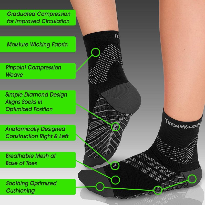 TechWare Pro Plantar Fasciitis Sock – Therapy Grade Targeted Cushion Compression Socks Men & Women. Ankle Brace Foot Sleeve & Arch Support for Achilles Tendonitis & Heel Pain Relief (Blk/Gry SML)