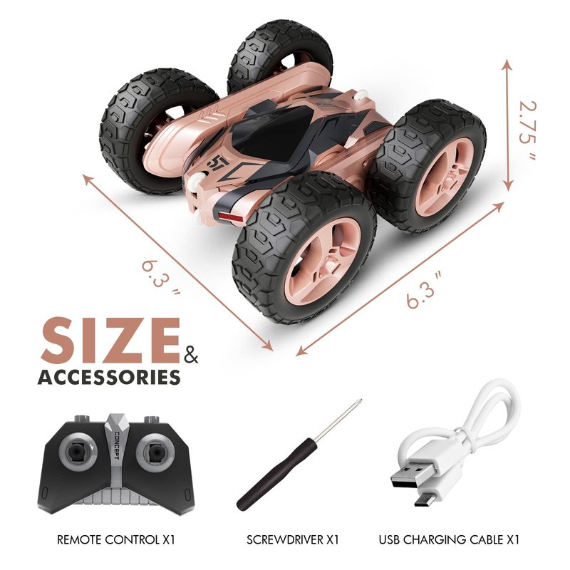 - 【Remote Control Fancy Stunt Car】 With forwarding, backward and flexible steering, you can control the toy car to go in any direction through the remote control. It can also perform many actions beyond your imagination. Flip, jump, double-sided driving, and 360°fancy spinning stunts will bring endless fun to kids.