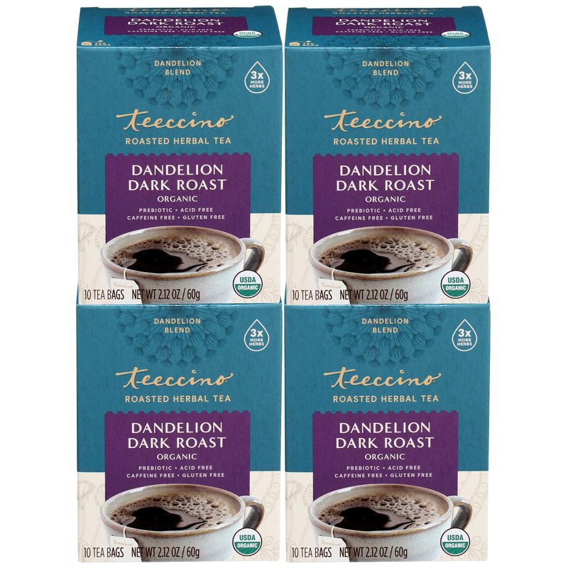 Teeccino Dandelion Root Tea - Dark Roast - Caffeine Free, Organic, Roasted Herbal Tea with Prebiotics, 3x More Herbs than Regular Tea Bags - Gluten-Free, Acid-Free Coffee Alternative - 10 Tea Bags (Pack of 4)