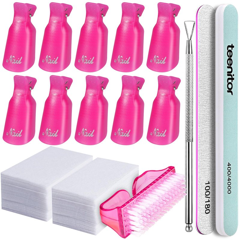 Teenitor Gel Nail Polish Remover Kit with 10pcs Nail Polish Remover Clips Cap 115pcs Nail Wipe Cotton Pads Nail Scraper Nail Files and Buffer Bushes - Hot Red