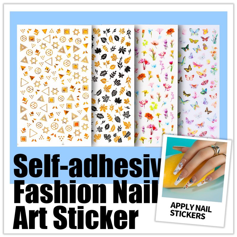 - 4 Topic of Self-adhesive Nail Art Stickers - Contain 4 different design: colorful butterfly, colorful flowers, gold & black maple leaf and gold geometric pattern, with these special sticker, you can create your personal nail art design with ease but not like a nail art beginner; come with tweezer help tear off the stickers and stick on nail surface as nail decoration
