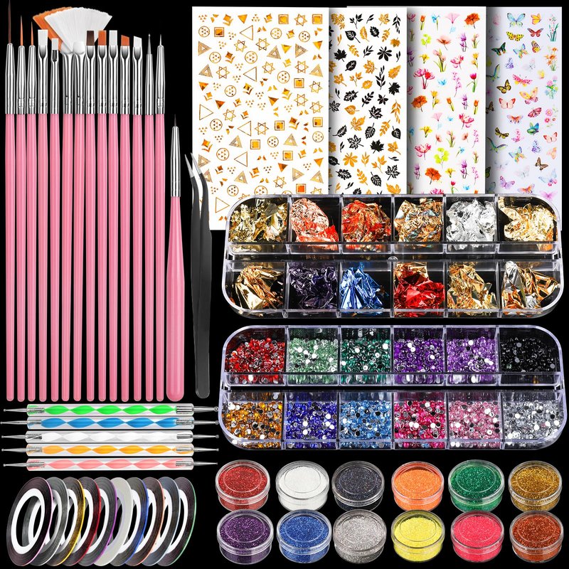 - Economical Nail Art Tool with Nail Glitter for Nail Art Beginners - You will get 12 pots nail glitter, 4 sheets nail sticker for nail art, 15pcs nail art brush pen, 5pcs nail dotted tool, 1 box 2mm nail art gems in 12 colors, 1 box 12 colors of nail foils for nail art, 10 rolls nail art tape for gel nails and 1pc tweezer