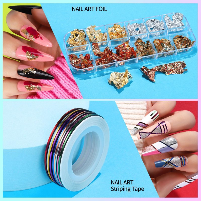 - Nail Art Foils & Nail Art Striping Tapes: 1 box nail foil in gold and silver color that is used for decorating your nails, making them shiny in any way you want. Nail art striping tape in a variety of colors to suit every client and meet all of your nail art design ideas. Easy to creates perfect straight line designs on nails