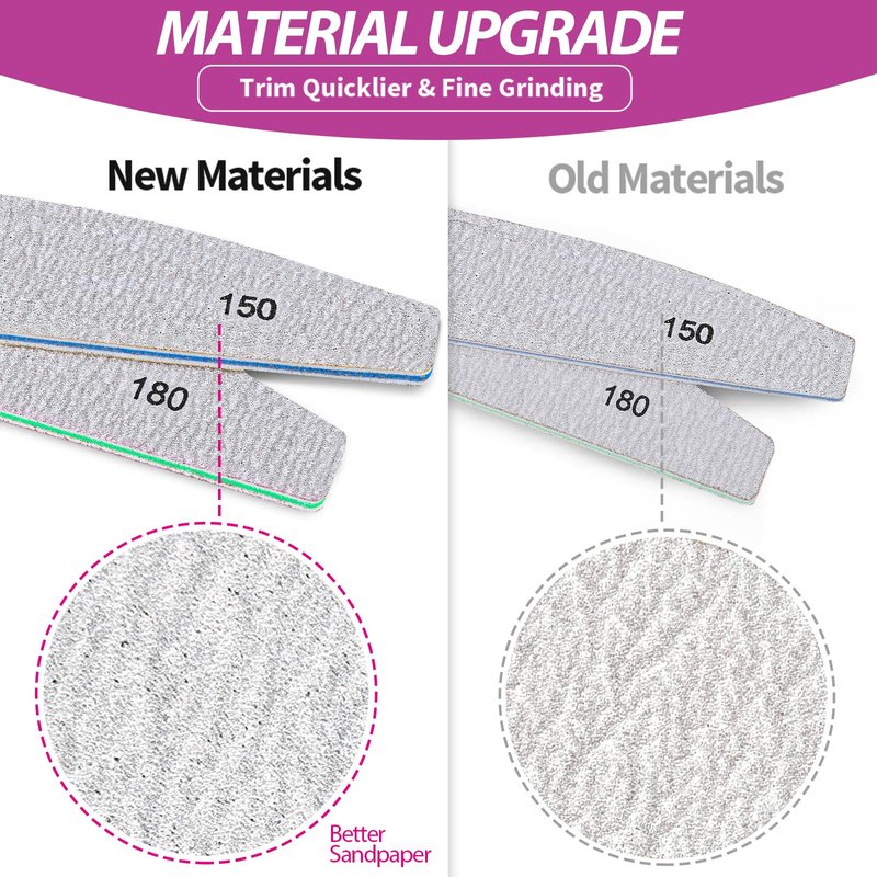 - 150/180/240 Nail Files for Acrylic and Gel Nails & Natural Nails: File - Start with this STEP 1 to trim your nails to desired length or shapes like Oval, Square, Squoval, Round, Almond, fit for fingernail & toenail. You can also use them to remove top coat of gel nails and acrylic nails(Tips: 150 grit is rough, 180 grit is medium and 240 grit is fine)