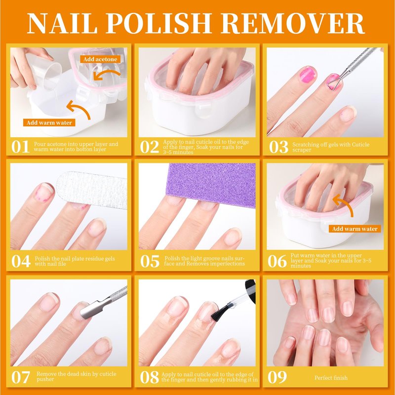 - Teenitor Nail Soaking Bowl Kit Meet all Your Needs:Nail polish removers tools kit come with 1* hand Soaking Bowl Acetone Proof, 1* cuticle oil, 1* cuticle pusher, 1* cuticle peeler, 2* nail files, 2*nail buffers, 8pcs in total. The nail soaking bowl provides with a more convenient nail polish remover and cuticle oil can protect and moisturize hands before and after nail polish remover, taking care of your hands