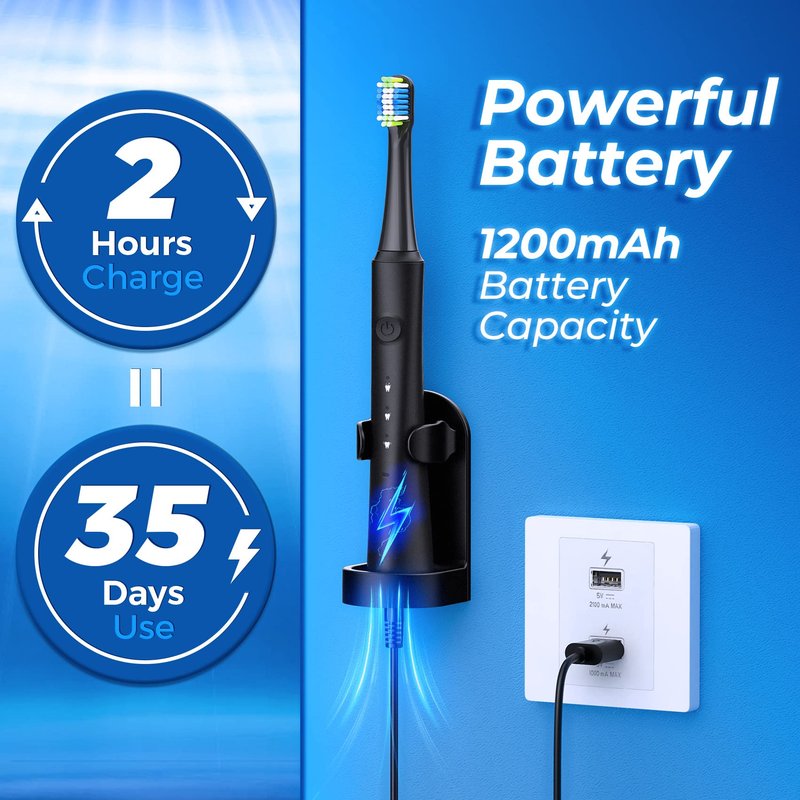 - 【35𝐃𝐚𝐲𝐬 𝐋𝐨𝐧𝐠‐𝐋𝐚𝐬𝐭𝐢𝐧𝐠 𝐂𝐨𝐫𝐝𝐥𝐞𝐬𝐬 𝐃𝐞𝐬𝐢𝐠𝐧】Enjoy the convenience of cordless brushing for up to 35 days on a single 2-hour charge (2 minutes x 2 times/day). Whether you're at home or traveling, our rechargeable electric toothbrush meets your needs and brings modern features to your oral care routine