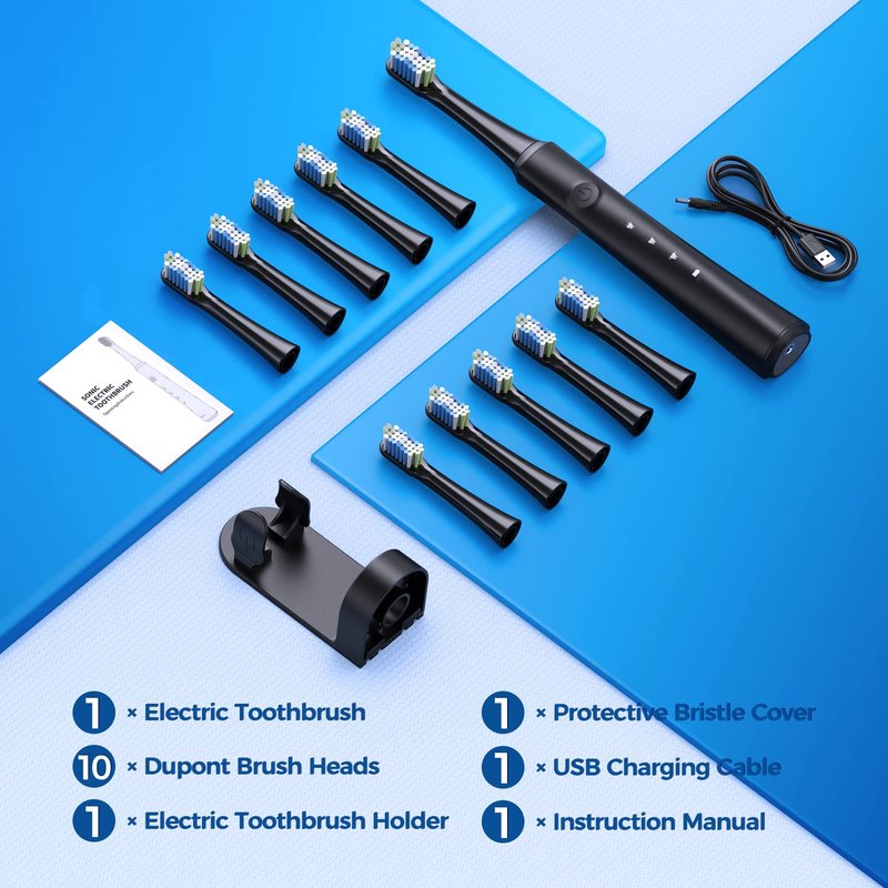 - 【𝐥𝐏𝐗7 𝐖𝐚𝐭𝐞𝐫𝐩𝐫𝐨𝐨𝐟 & 𝐖𝐡𝐚𝐭'𝐬 𝐥𝐧𝐜𝐥𝐮𝐝𝐞𝐝】Our toothbrush electric is IPX7 waterproof, allowing for use in the bath or shower. The package includes 1 electric toothbrush, 10 Dupont toothbrush heads, 1 USB cable, 1 Toothbrush Holder and 1 instruction manual