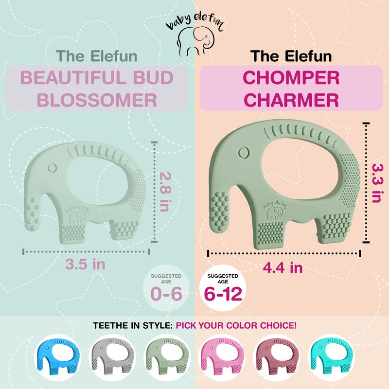 - 5X smart pain relief surfaces = mom’s not a chew toy: while other teethers for babies 6-12 months train growing baby that mom’s nipples are a chew toy - Ouch! - Elefun Pacifies baby into bliss, with 5 strategically designed teething surfaces that keep baby interested in chomping on their Best Little EleFriend and not on their parents poor hands. Nom. Nom. nom. Blisssss.