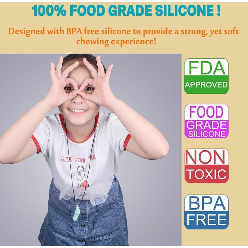 - ✔️100% SAFE AND NON-TOXIC – 100% Certified food grade silicone, without taste and odor,non-toxic BPA free, PVC, phthalates, cadmium. Its adjustable string & breakaway clasps make it safe to use for most children.