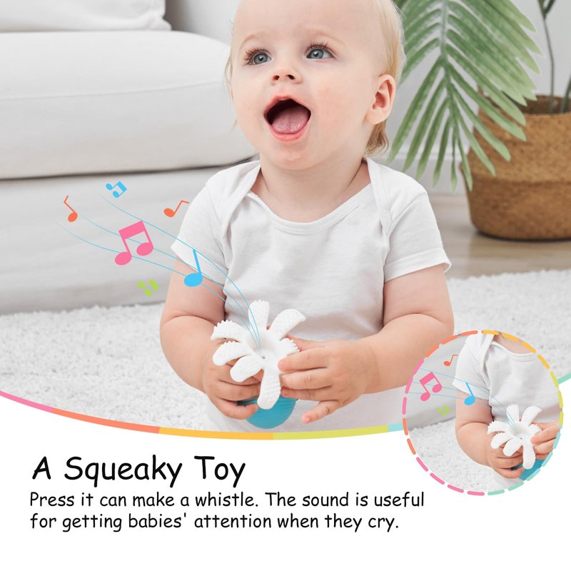 - COMBINATION OF TEETHERS AND TOYS- Press the body will make a sound like whistle, stimulate baby's senses. Can be folded into a ball, easy to store and carry. Can be sucked on baby's face when pressing the Octopus's body and placing the tentacles on face. Also can be a car decoration, a pacifier buddy toy that makes car rides easily.