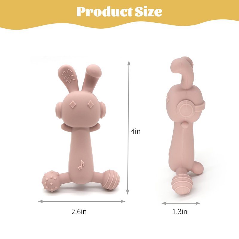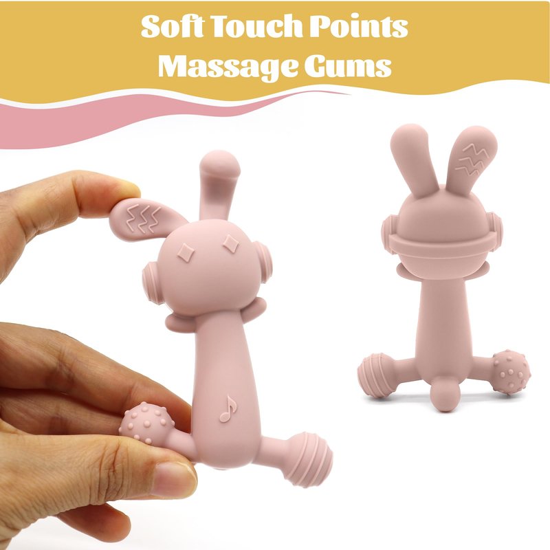 This baby teething toy is made of soft silicone, which is safe and non-toxic for babies to chew on. It has a cute rabbit shape and a variety of textures to help soothe baby's gums during teething. The rabbit toy is also designed to be easy to grip and hold, making it ideal for babies who are just starting to learn to grip and hold objects. The teething toy is also BPA-free, making it safe for babies to put in their mouths. It is a great gift for babies who are teething or for babies who are just starting to explore the world with their mouths.