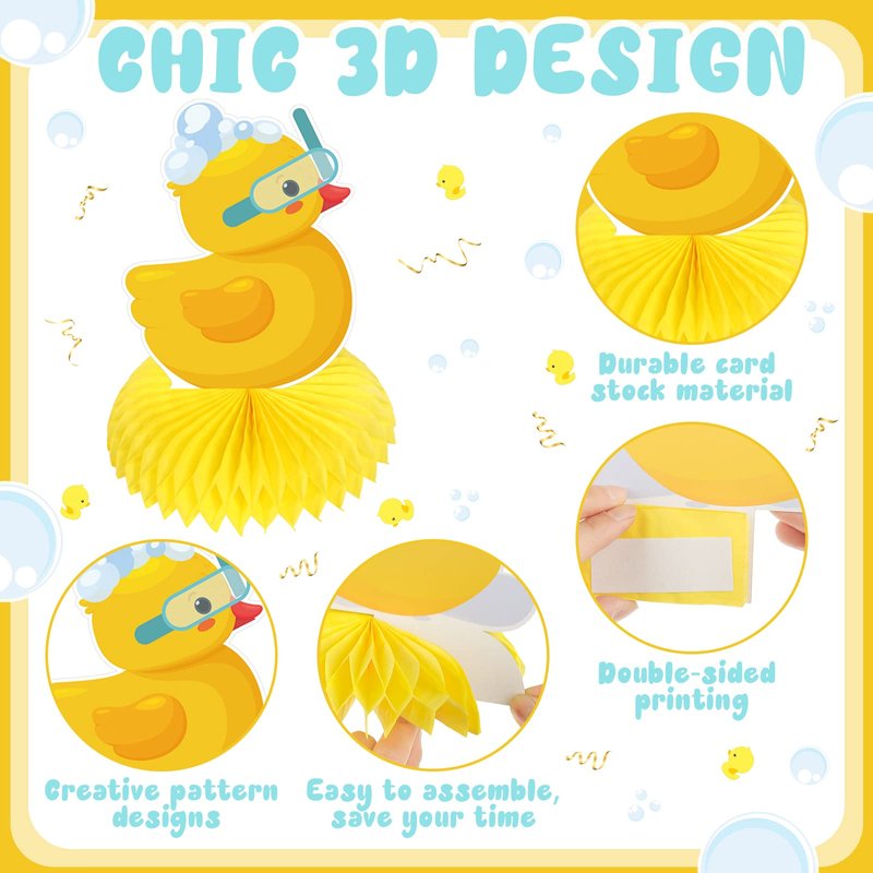 Features: Ducky centerpiece table decor is designed with 12 different ducky elements designs, which can easily attract guests' attention and leave a deep impression on them. Add these ducky party decorations to your party supplies for your gift table or food table. These centerpieces make for really cute baby shower decorations too. Specifications: Material: card Color: as pictures shown Size: approx. 6 inch/ 15 cm Package includes: 12 x Ducky honeycomb centerpieces Notes: Manual measurement, please allow slight errors on size. The color may exist a slight difference due to different screen displays.