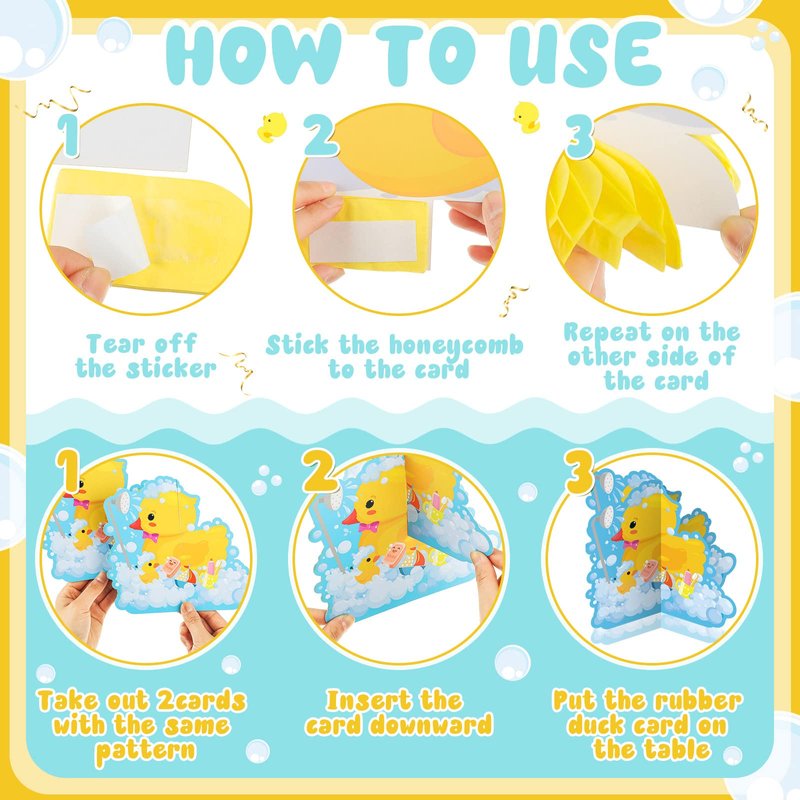 - Easy to Use: first, tear off the sticker of the duck honeycomb ball, and then paste the honeycomb ball on the fixed area of the card, and repeat on the other side; Then insert the card vertically downward and finally put it stand on the table