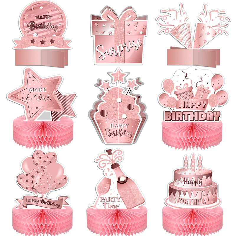 Teling 9 Pack Happy Birthday Party Decorations Birthday Table Honeycomb Centerpiece Double Sided Rose Gold Centerpieces for Table Birthday Table Decorations for Women Girls