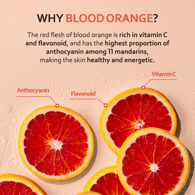 - WHY BLOOD ORANGE? The red flesh of blood orange is rich in vitamin C and flavonoid, and has the highest proportion of anthocyanin, making the skin healthy and adding radiance to dull skin