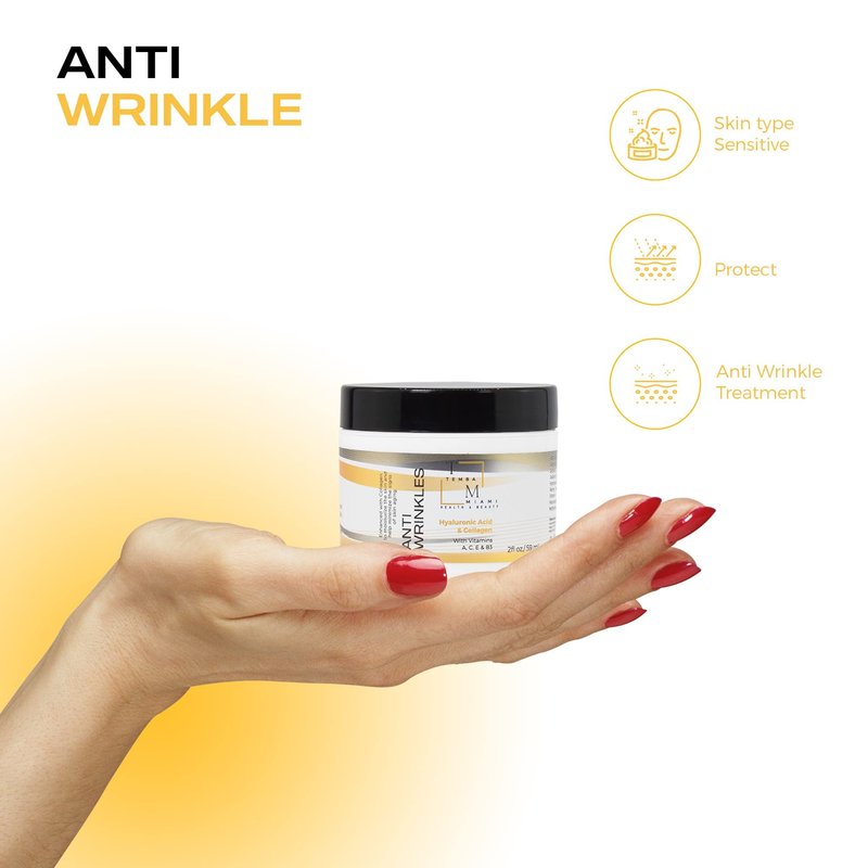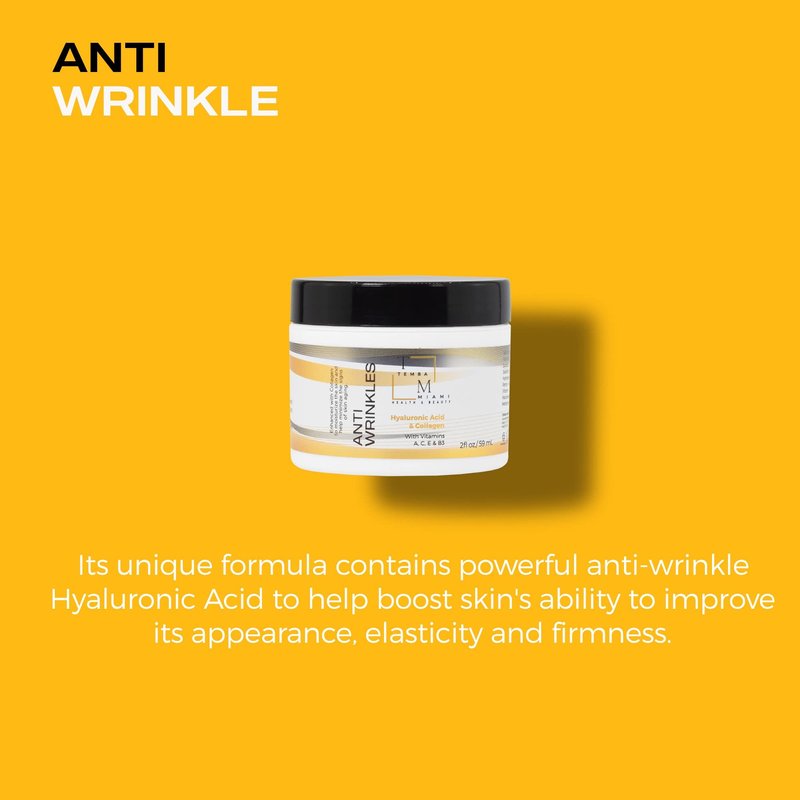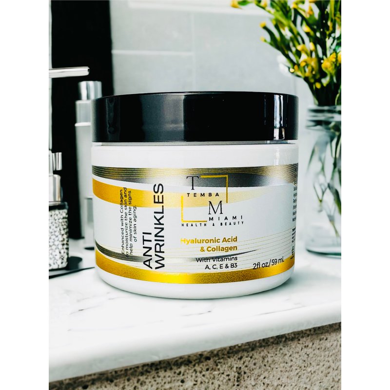 ANTI-WRINKLE Cream for ALL SKIN TYPES made with Purified HYALURONIC ACID to smooth the look of fine lines and plump skin, giving you a visibly smoother younger looking skin. Enhanced with COLLAGEN and SHEA BUTTER. COLLAGEN is a major component of your skin and It plays a role in strengthening skin, as well as in elasticity and hytration . ENRICHED with VITAMINS A, C, E & B3. NO PARABEN/ NO COLORANTS/ NO DRYING ALCOHOLS/ Made in Miami, FL USA.