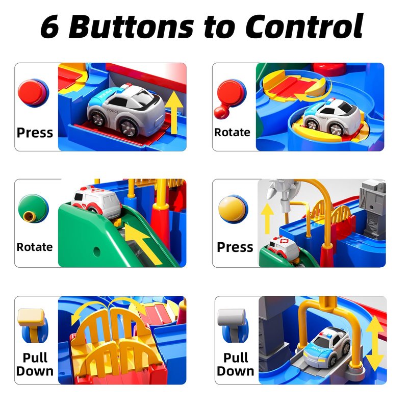 - Exciting Racing Experience: Our kids toy cars(10x10x7in) has the specific design, with 4 buttons and 3 little cars: police car, ambulance toy and fire truck toy(or taxi). The track toys include loops, jumps, and obstacles to enhance creativity and racing
