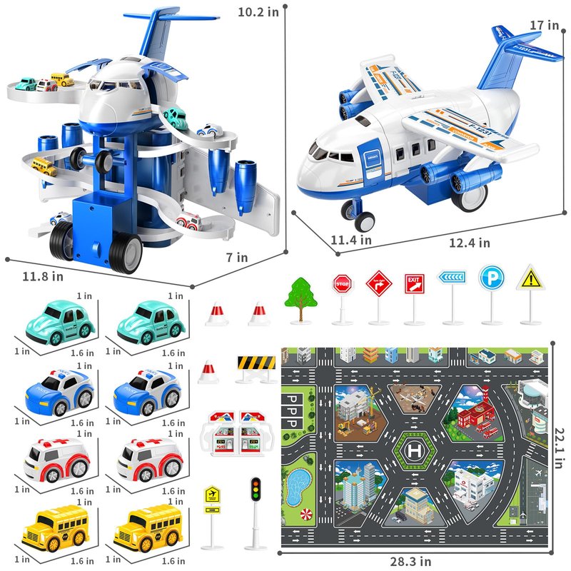 - Airplane Toy: This airplane toys has a big aircraft and track model(11.8×7×10.2in), police car (1.6×1×1in)x 2 ambulance(1.6 ×1×1in) x 2, taxi(1.6×1×1in) x 2, and bus car (1.6×1×1in) x 2, activity soft mat(28.3×22.1in), 14 pieces traffic and road signs