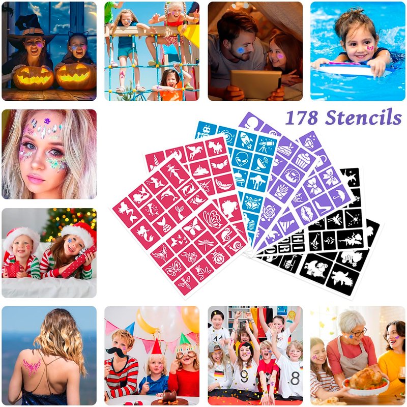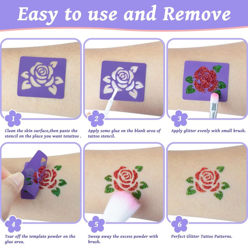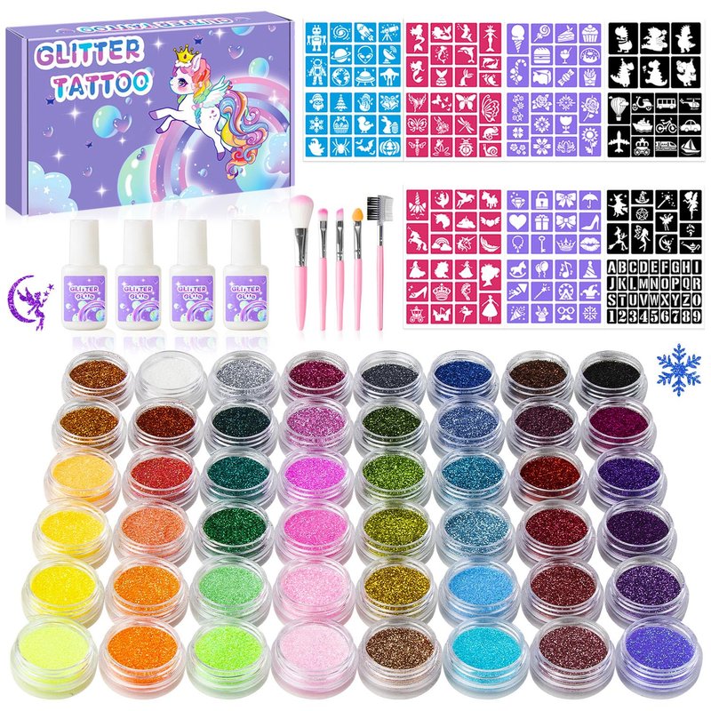 - 💖💖★【Tattoo Glitter Set】48 colors tattoo glitter, 14 tattoo stencils (178 patterns), 5 makeup brushes, 4 bottles of glue, 1 gift box. This tattoo glitter kit contains everything you need to make your entire party unique and sparkling. Enjoy the fun of glitter tattoos with your friends and family.