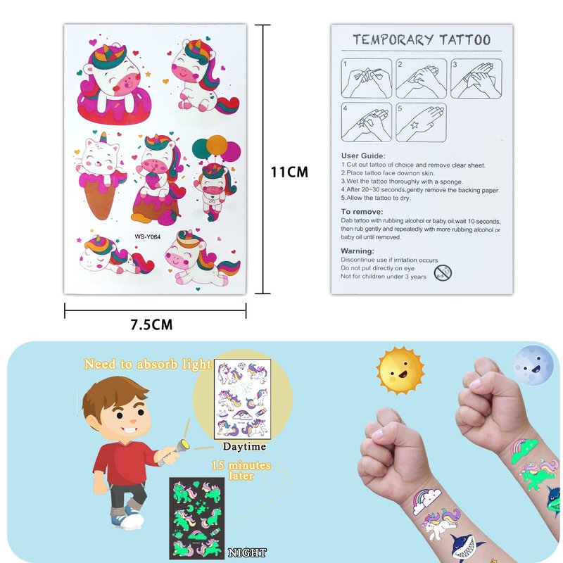 - [ Skin-Friendly and Safe for Kids ] Glowing tattoo stickers are made of natural ink. Non-toxic and odorless. Waterproof and sweatproof. Daytime is colorful. Luminous at night. Can easily cope with the pool, beach, travel, party and other occasions