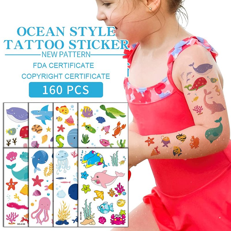 - Ocean Cartoon Tattoos Design - 10 Sheets 160pcs Cute Different Funny Ocean Style Cartoon Tattoos Stickers Pattern For Kids Boys Girls Women Men. Add Some Elements Of Interest Cartoon. Be unique to the party and help your kids share these tattoos with their friends.Mixed style tattoo stickers set are very fun for children. You can apply them to your body or some smooth objects, for example, glass, tile, stationery, paper, stainless steel, plastic, present box, mobile phone shell, car