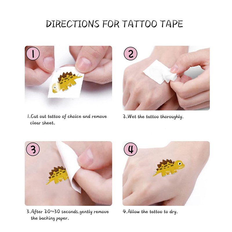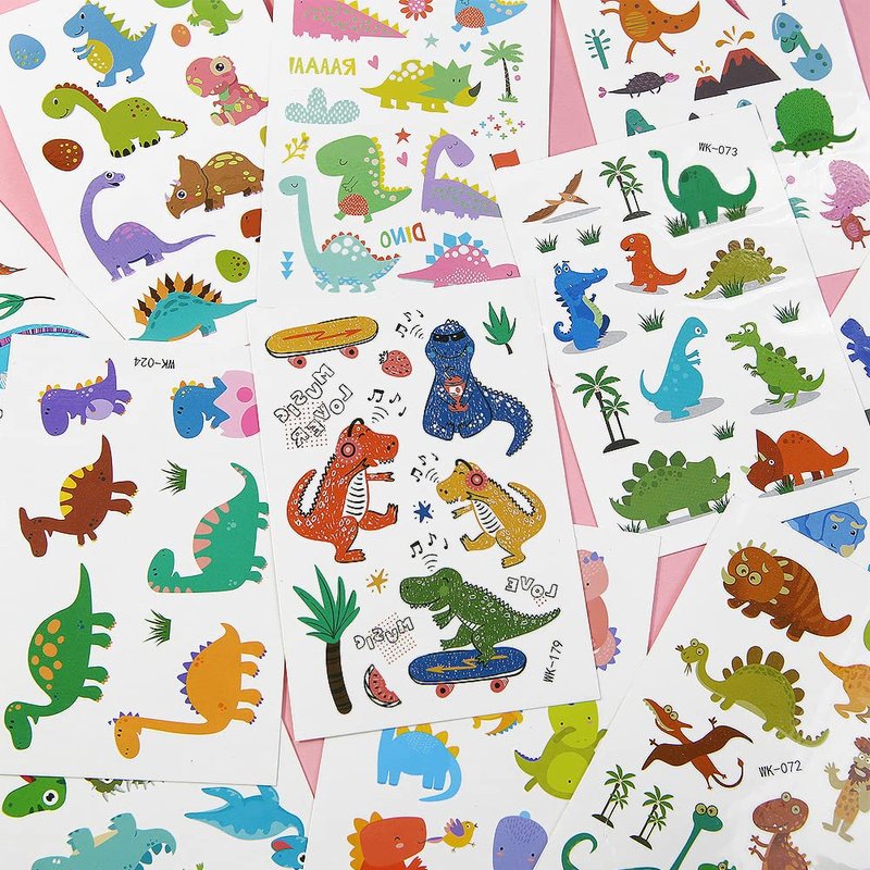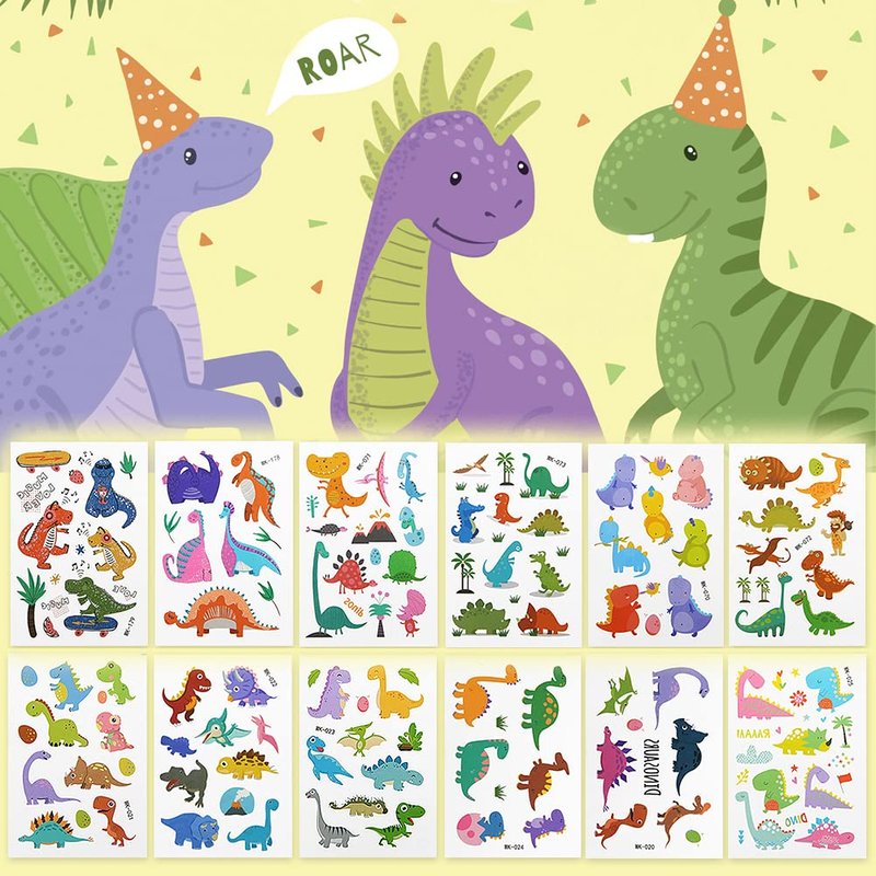 - Package includes:Comes with 12 sheets tattoo stickers in various patterns,each sheet tattoo size is 2.9x4.3 inch/7.5x11 cm. Dinosaur temporary tattoos are perfect for dinosaur birthday party supplies, DIY crafts, gifts and rewards, everyday toys.