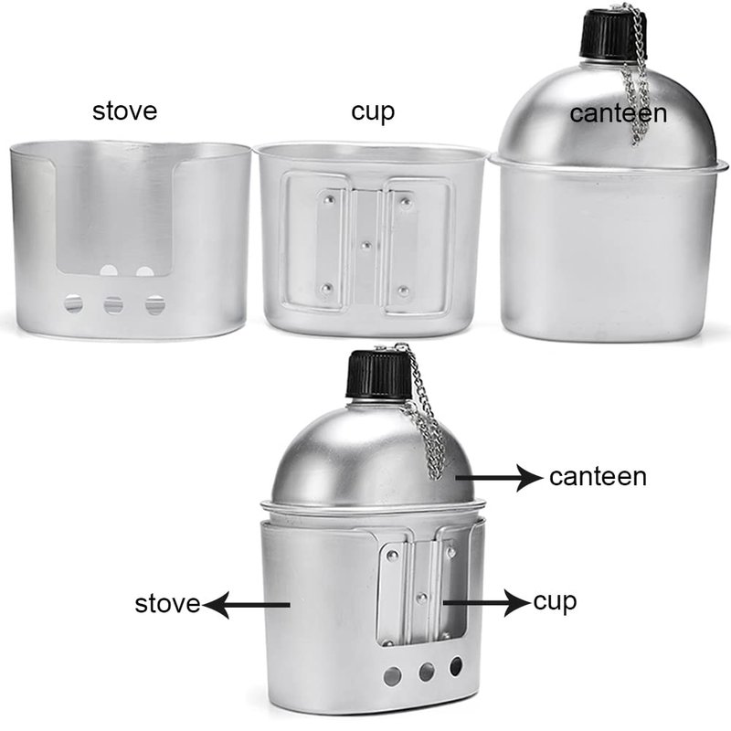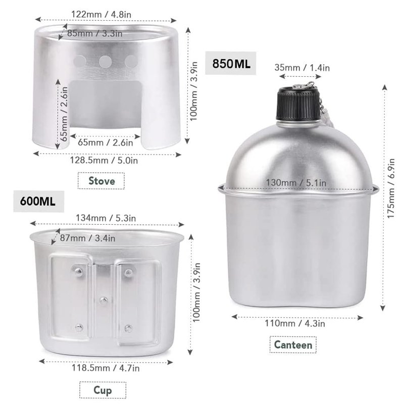 - Package - 4pcs canteen cooking set includes a 850ml canteen, 600ml cup, wood stove and a canteen pouch.