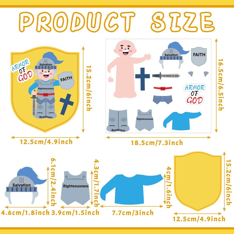 Features: Play these Sunday School activities for kids with your kids or students can quickly enhance your relationship and increase interactions, as well as leave fond memories in the process of their growing up. Our Armor of God crafts kit is suitable as a fun gift for your family members, relatives, friends, classmates and neighbors, to express your care and love. Specifications: Material: card Color: as shown in pictures Size: as shown in pictures Package includes: 36 x Armor of god DIY craft kits Notes: Manual measurement, please allow slight errors on size. The color may exist a slight difference due to different screen displays. Small parts contained, please keep away from little kids.