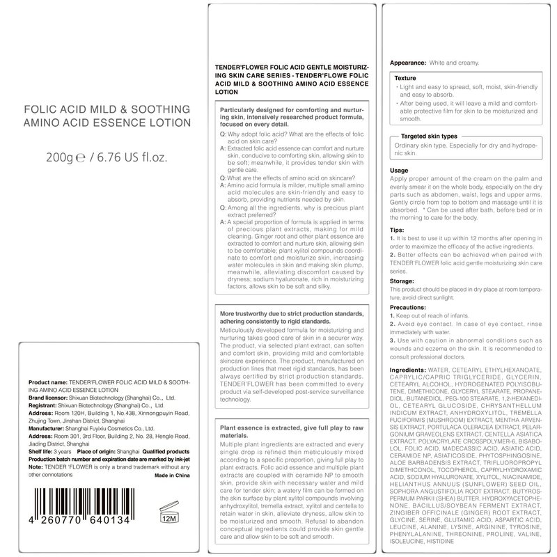 【Usage】 Take an appropriate amount of this product and apply it to the abdomen, chest, legs and other parts of the body that are prone to dryness, discomfort or need skin care. Abdomen: From the navel as the starting point, massage in a gentle circular clockwise direction. When making a circle, it should spread outward from small to large until it is evenly and fully massaged. Chest: Massage gently in circular motions from the inside to the outside with the finger pulp. Legs: Starting from the knees, massage from bottom to top. Skin feeling: Mild, light, and comfortable, the skin is soft and glowing after use. Efficacy: Improve skin roughness and make skin soft and smooth. 【Skin Type】 Normal skin type. Especially suitable for dry, dull, and other skin types. 【Tips】 1. Due to plant extracts, the unopened shelf life is 3 years. Use within 12 months after opening. 2. It is better to use it in combination with other products of TENDER'FLOWER gentle smoothing oil series. 【Precautions】 1. Please keep it out of reach of children. 2. During use, if you feel uncomfortable, please stop using. 3. Avoid contact with eyes, if it gets into eyes accidentally, please rinse with plenty of water. 4. Use with caution if there are wounds, eczema, and other abnormal conditions on the skin, it is recommended to ask for professional advice.