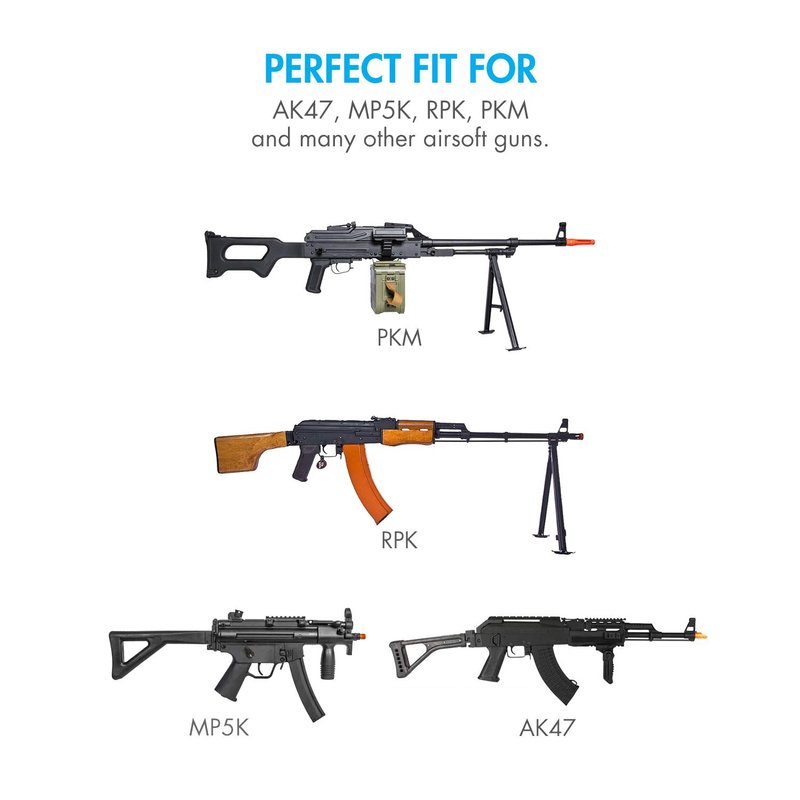 - Compatible with airsoft guns like: AK47, MP5K, RPK, PKM, CYMA CM.028U, Crosman Pulse R76, GR8, DE UMP M89, Kalashnikov, Stg44, ERICS13, SIG 552 and other upgraded and/or modified AEGs, we recommend measuring the gun compartment for best fit.