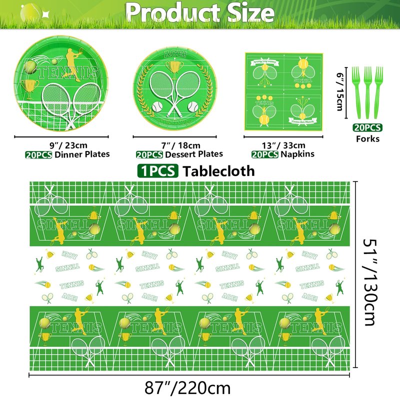 - 【Tennis-Themed Birthday Party Supplies】Package includes 20 x 9’’ dinner plates, 20 x 7’’ dessert plates, 20 x napkins, 20 x forks, 1 x tennis tablecloth.